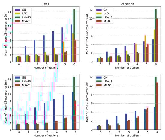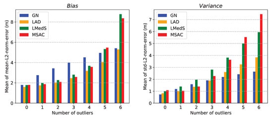 - In the case of no outliers, the RANSAC performed similar to the GN method, whereas the LAD performed slightly lower than the GN method and the LMedS performs slightly lower than all of the estimators in term of both the metrics (bias and variance).