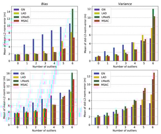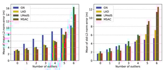 - In the case of low-level noise in the inlier measurements (1st row of Figure 7), a noticeable breakdown happened for LMedS when the number of outliers is 6 (i.e., more than ), while the LAD and RANSAC were on the verge of breakdown. However, in the case of high-level noise (3rd row of Figure 7), the breakdown happened for all the three robust estimators, but the LAD still performed marginally better than the other two robust estimators.