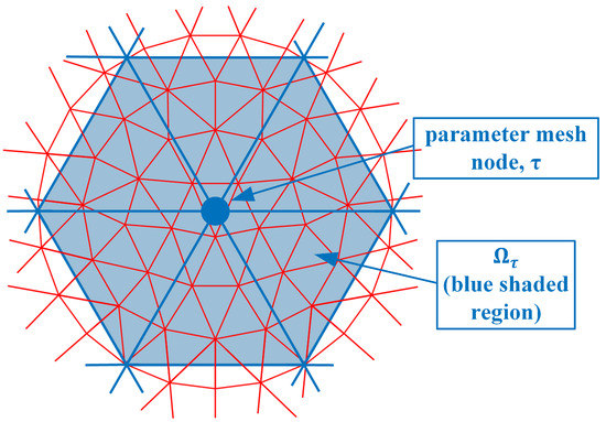 Beginning with the finite element representation of the dual mesh-based nodal adjoint method derivation of the Jacobian matrix [43], Figure 1 shows the overlapping forward solution mesh (red) and the parameter mesh (blue). For the 2D case, all of the forward solution and parameter mesh elements are triangles. This discussion is readily extended to the 3D case by replacing the triangles with tetrahedrons and expanding the forward solution from this scalar problem to the necessary 3D vector forward distributions. In previous implementations, the size of the forward solution mesh elements was noticeably smaller than that for the parameter mesh because the former’s size is dictated by the sampling requirements to achieve an accurate forward solution [49].