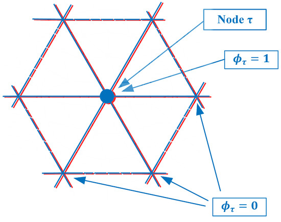 In this case, there are six parameter mesh elements surrounding node and only seven forward solution mesh nodes within . In fact, for the integration (summations) which is performed over just the six -associated elements, the terms are only non-zero for node and zero for all the surrounding ones (Again, this is true for the linear basis functions used in this derivation). In this case, the inner summation can be reduced: