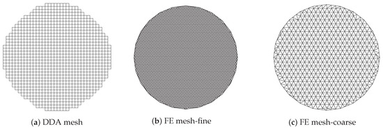 The imaging zone is a step-wise circle consisting of 1012 squares and 1085 vertices (i.e., the number of unknowns) with an effective diameter of cm. Figure 6b,c show the corresponding finite element (FE) meshes used in our FE-based reconstruction algorithm. As with the DDA approach, the antennas are configured on a circle concentric with the centre of the imaging zone. The meshes for the dual mesh approach (one for the forward solution and one for the property reconstruction) are both inside the antenna array with diameters of cm. It should be noted that for the forward solution, the region outside of the meshes is represented using the boundary element method comprised of the homogeneous medium and having outer boundaries extending to infinity [50]. The fine mesh (forward solution) has 3903 nodes and 7804 triangular elements while the coarse one (reconstruction) has 559 nodes and 1044 elements. The average node spacing for these two meshes is mm and mm, respectively.