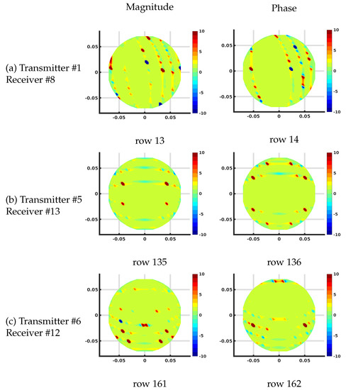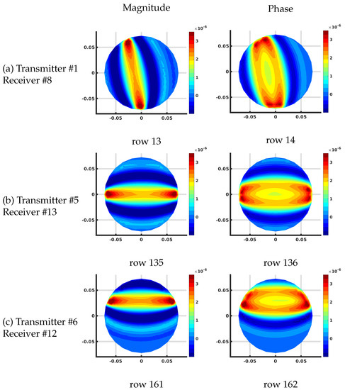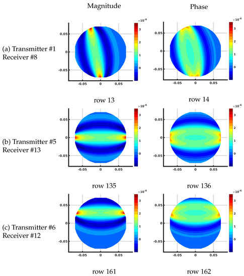 In this case, the complex values are transformed into their effective log magnitude and phase values via their transformation relationships described in Meaney et al. [39] for viewing their distributions. The different cases include: (a) transmitting at antenna and receiving at antenna , (b) transmitting at antenna and receiving at antenna , and (c) transmitting at antenna and receiving at antenna , respectively. For the magnitude plots, there is a cigar-like yellow and red zone extending straight between each of the associated antennas and decreasing rapidly and oscillating about zero in the orthogonal direction to both sides with respect to the main axis of the band. Given that each matrix term is the change in the field measured at the receiver with respect to a change in the properties at a pixel for a signal broadcast at a transmitter, these distributions effectively represent sensitivity maps for the given transmit/receive pair antennas. It is important to note that these distributions are reciprocal—i.e., the distribution for transmitting from antenna A to B is the same as that for transmitting from B to A. Reciprocity is a key feature in exploiting the adjoint technique. The corresponding phase plots show a similar but wider main band extending between the associated antennas. Extending outwards in the orthogonal direction from this main band, the phase values increase from negative values and then oscillate about zero outwards while diminishing in amplitude.