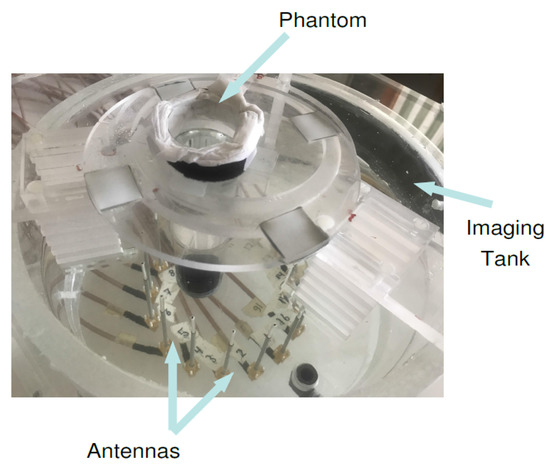 The microwave breast imaging system at Chalmers University of Technology [53] is comprised of an imaging tank filled with a coupling medium, i.e., mixture of glycerin and water (80:20 ratio) and a surrounding circular antenna array comprised of 16 monopole antennas. The lossy mixture is a tissue mimicking medium and resembles the breast tissue for purposes of imaging. The 4 cm diameter cylindrical phantom filled with 84:16 glycerin–water mixture is positioned in front of antennas and , shown in Figure 10. The scattering parameters of the system were measured via the Vector Network Analyzer (Rohde & Schwarz ZNBT8) connected to the antenna array, and are provided as the measurement data to the reconstruction algorithm in form of two sets of 240 (16 transmitter × 15 receiver per transmitter) measurements (magnitude and phase parts of the electric fields).