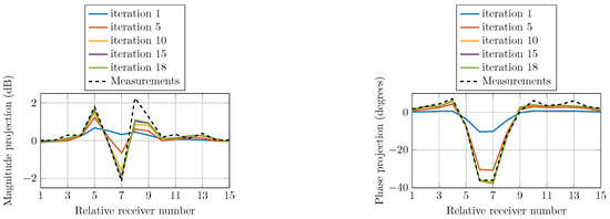Comparison of calculated magnitude and phase projections of the signals transmitted from Antenna 1 for multiple iterations as a function of receiver number. The actual measurement projection is also shown.