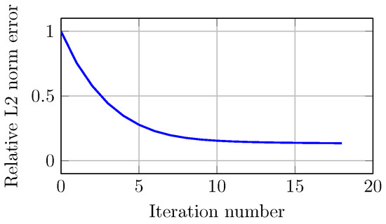 Figure 13 shows the error of the optimization process for image reconstruction. The relative error (normalized to the first iteration) decreases monotonically with increasing iterations. In this case, the error decreased from 1 to in 18 iterations. The stopping criterion is met when the decrease in error from one iteration to the next is less than 1 × 10.