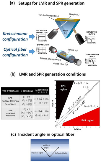 (a) Structure of Kretschmann configuration and D-shaped optical fiber; (b) conditions of the material for the generation of lossy mode resonance LMR and surface plasmon resonance SPR; (c) schematic of the incident angle in an optical fiber [26]. Reprinted from Sensors and Actuators B: Chemical, 240, Del Villar et al., Optical sensors based on lossy-mode resonances, 174-185, Copyright 2016, with permission from Elsevier.