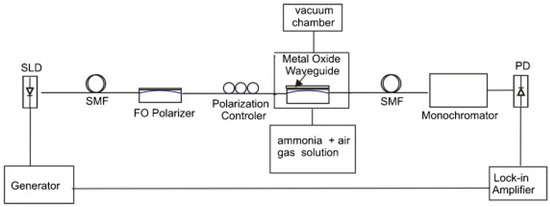 A similar work using ZnO as sensing material is also presented by A.OG. Dikovska et al. in [59]. In this case, three different films of ZnO were studied. The films were classified as smooth, porous and nanostructured. The sensor was formed by a side-polished single-mode fiber, known as D-shaped fiber (D-shaped fiber is obtained polishing a SMF and removing a side of the cladding until the core is almost exposed), with a nanostructured ZnO thin-film fabricated onto the plane region. The fiber was glued to a fused quartz block, and a ZnO layer, lower than 30 nm in thickness, was grown on the top of the sensor by the pulsed laser deposition (PLD) technique [60] in two steps (first, on-axis PLD configuration, and second, off-axis PLD configuration at a distance of 1.5 cm). The interrogation setup (see Figure 2) consists of a transmission setup with polarized light from a SLD light source where a photodiode in combination with a monochromator collect the output light. The resonance shift is monitored with concentrations of ammonia between 500 and 5000 ppm with the three different films. The best results were obtained with the nanostructured film that shown a 6.35 nm resonance shift between 0 and 5000 ppm (2.14 nm and 0.81 nm shift was obtained for porous and smooth films, respectively) and a detection limit of 50 ppm.