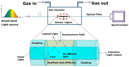 A previous structure (PMMA CRMMF with an overall diameter of 750 µm and a numerical aperture NA = 0.5) was also employed by R. Mohandoss et al. using magnesium tetraborate (MTB) as the sensing material [47]. The sensing structure was fabricated using the slurry deposition method. This deposition technique consisted of mixing the sensing material with isopropyl alcohol that later dries, leaving the sensing material in the desired place. Different modifications of the sensing material have been explored such as cerium doped, glassy form and gamma irradiated. The setup of the sensor can be seen in Figure 3. Here, a halogen light source couples the light to the modified optical fiber and a spectrometer analyses the output visible light (200–1100 nm) as a function of the ammonia concentration (0–500 ppm). The spectral response is modified in amplitude with maximum intensity at 685 nm. The results show an increase in the sensitivity to ammonia gas in Cerium doped (0.25 mol.%) samples. Additionally, the samples irradiated with a dose of 20 Gy in a 60Co gamma chamber improve previous results, making the gamma irradiated MTB:Ce glass an efficient fiber optic based ammonia sensor with a sensitivity of 74 counts/50 ppm. This structure has great potential to be used in LMR based gas sensors.