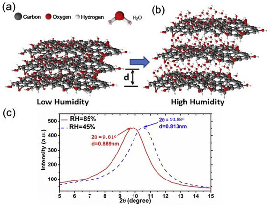 (a) Graphene oxide GO film with low humidity. (b) GO film with water molecules in high humidity. (c) X-ray diffraction (XRD) spectra with relative humidity of 45% and 85% [44]. Reprinted from Sensors and Actuators, B Chem. 255, Huang, Y. et al., High-performance fibre-optic humidity sensor based on a side-polished fibre wavelength selectively coupled with graphene oxide film, 57-69, Copyright 2017, with permission from Elsevier.