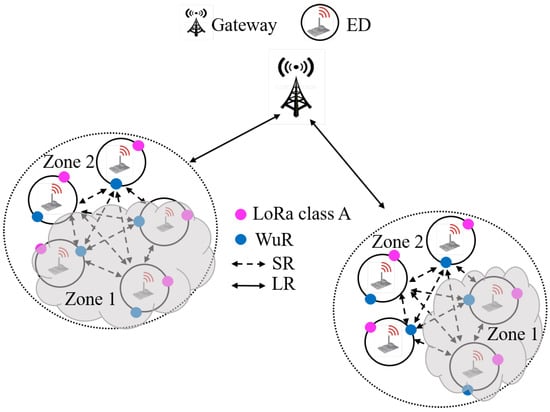 The heterogeneous network architecture considered in this work is shown in Figure 1. Nodes are distributed in clusters in which they can communicate with each other using Short Range (SR) communication [6,26]. At a distance of few kilometers from a cluster, a gateway can receive data from nodes or may send commands to the nodes using Long Range (LR) communication like the traditional LoRa scheme (i.e., LoRaWAN). The command can be, for example, a command for changing the data rate or any control command for actuators-based applications. Therefore, this network architecture targets applications for which the gateway can have control of the network for data collection, nodes configurations and even actuator activation. Each node embeds two different communication modules. The first one can handle LoRa and OOK modulations. This transceiver allows switching from both modulation schemes, LoRa is used for the LR communication with the gateway, and OOK modulation is used between nodes that are in the SR of each other. The other module is a WuR that is always listening to the channel and receives data with OOK modulation as form of a WUB. Nodes use LoRa class A to communicate with the gateway; thus, they are passing most of their time in sleep state and are only wake-up to send data to the gateway or when they receive an interrupt from the WuR. Furthermore, all nodes are equipped with an energy harvesting device, for example, a solar panel. In a real deployment, some nodes will obviously harvest less power than others, either because a problem occurs in their solar panel, or being hidden by an obstacle or being under the cloud. Therefore, two types of harvesting conditions are considered in Figure 1: nodes that harvest less energy are in zone 1 and those that harvest more energy are in zone 2. Nodes that are in zone 2 will maximize their uplink QoS that is expressed in terms of packet generation rate. On the contrary, those who are in zone 1 will reduce the uplink QoS as they harvest less energy. The uplink QoS tuning according to the harvested will be presented in Section 5.1.