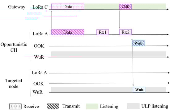 The proposed MAC protocol is described in Figure 2. It concerns nodes that are in the SR of each other, thus forming one cluster. It is assumed that the gateway already knows the location of all nodes and all the potential clusters. Nodes communicate with the gateway using LoRa class A. When a node sends data to the gateway, it opens two receive windows as it is in class A and becomes systematically an Opportunistic Cluster Head (OCH). Therefore, the gateway can take the opportunity from one of its receive windows to send Command (CMD) intended to another node called targeted node. If the OCH receives during one of its receive windows a CMD that it is intended to the targeted node, it switches its LoRa module to OOK modulation and forwards the CMD in the SR to the targeted node as form of a WUB. The WUB contains the address of the targeted node and the CMD itself. The targeted node will receive the WUB via its WuR. Thanks to this MAC protocol, namely LoRa-WuR, the downlink latency will considerably be reduced, as the gateway will take the opportunity from any receive window of any node. Nodes that are in zone 1 (low energy), having a lower uplink QoS than those in zone 2 (high energy), become less frequently OCH than those in zone 2, but all nodes cooperate together as each node can become an OCH during one of its LoRa receive window.