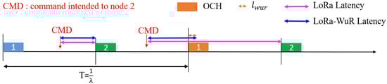 Figure 3 illustrates the difference of latency between the traditional LoRa scheme and LoRa-WuR one. A chronogram with only two nodes is presented for clarity purpose. For LoRa scheme, when the gateway sends a CMD intended to node 2, it has to wait until the node 2 will be active to receive the CMD during its receive window. However, for LoRa-WuR scheme it has to wait any node to be active that will become an OCH, i.e., node 1 in this illustration, to transmit the CMD and then the OCH forwards it to node 2 using the SR communication.