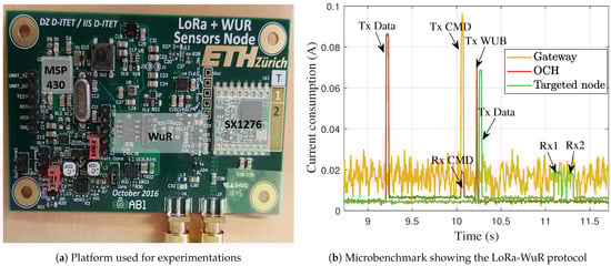 The proposed LoRa-WuR MAC protocol was implemented on the platform designed in ETH Zurich [27] and shown in Figure 4a. It contains a SX1276 module from Semtech that allows OOK modulation and LoRa, a WuR from Reference [5] and an MSP430 MCU from Texas Instruments.