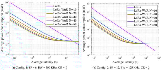 Figure 5 shows the average power consumption of a node as a function of the average downlink latency for both schemes LoRa and LoRa-WuR, and with different number of nodes N ranging from 10 to 50 in case of LoRa-WuR. Moreover, two different configurations of SF, BW, and CR are set and are listed in the Table 2, and are also noted at the bottom of both Figure 5a,b. These results are obtained from analytical models that are fed with the measured power consumption of the different operating modes. The average downlink latency and the average power consumption only depend on the downlink QoS for LoRa scheme, whereas they depend on both the downlink QoS and the number of nodes for LoRa-WuR. The uplink QoS is varied from packet/s to 0.1 packet/s. It can be seen from Figure 5a that the node achieves lower power consumption and lower downlink latency than the node in Figure 5b, as it uses the lowest SF. The choice of the configuration has an impact on both downlink latency and the average power consumption of the node, but the performance gain of LoRa-WuR over LoRa scheme is about the same for both configurations. It appears from both figures that to achieve the same downlink latency with LoRa-WuR as with LoRa scheme, the average power consumption is reduced with LoRa-WuR when the downlink latency is less than 2.2s and 8.3s, respectively, in case of Figure 5a,b. For example, to achieve 250 s, the average power consumption is reduced down to 8.9 times (Figure 5a) and 9.4 times (Figure 5b), respectively, with 10 nodes compared to LoRa. However, when the downlink latency is very high and greater than 2.2s (Figure 5a) and 8.3s (Figure 5b), respectively, the traditional LoRa scheme becomes more energy efficient than LoRa-WuR because of the overhead of idle listening of the WuR. It can also be seen that, for LoRa-WuR, the higher the number of nodes is, the lower the average power consumption is. For example, to achieve a downlink latency of 250 s, the average power consumption is reduced down to 3.7 times (Figure 5a) and 4.3 times (Figure 5b), respectively, with 50 nodes compared to when using 10 nodes. This is due to the fact that, to achieve the same downlink latency, the uplink QoS needs to be higher when the number of nodes is low compared to when the number of nodes is high, which induces an increase of the power consumption.