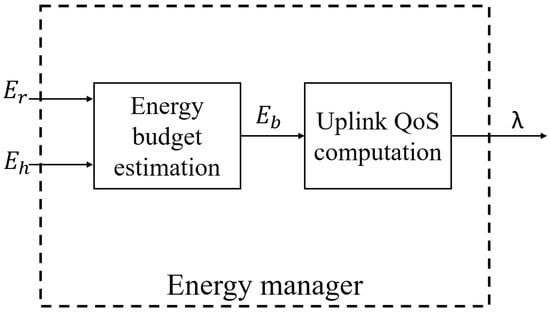 In this section a combination of the LoRa-WuR architecture with solar energy harvesting profile is considered. Therefore, the uplink QoS is tuned for each node according to the harvested energy with an energy manager. An energy manager is proposed and compared to two different energy managers. The proposed energy manager is called Redistribution of the Harvested Energy (RHE) that allows a small variation of the uplink QoS between days and nights. Figure 6 shows the procedure of the energy manager which consists in two blocks: the energy budget estimation and the uplink QoS computation. The energy manager is periodically executed at each slot , the energy budget estimation block estimates the energy budget that corresponds to the energy that a node can consume in the next slot. Then, according to this and the used MAC protocol, the uplink QoS is calculated for each node.