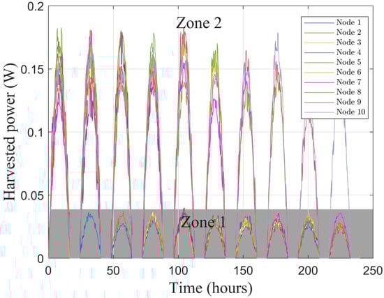 Outdoor solar daytime energy sources are considered in this study and power traces are generated by considering a solar panel area set to 30 cm for each node. As in real deployment some nodes will harvest less power than others, either because they are hidden from the solar source or due to a dysfunction of their solar panel. Therefore, the average power density is equal to 50 W/m for nodes that are in zone 2, whereas it is set to 10 W/m for nodes in zone 1 that harvest less energy. Figure 7 shows the harvested power traces generated for 10 nodes during 10 days using the algorithm proposed in Reference [28], with nights lasting for 8 h. To evaluate the influence of the ratio between the number of nodes in zone 1 and in zone 2, one node is moving each day from zone 2 to zone 1. The first day, all nodes are assumed to have the same average harvested power and are in zone 2. The second day, one node moves in zone 1 and has a reduced average harvested power and so on until the last day when nine nodes have a reduced average harvested power and only one node is still in zone 2 with a high average harvested power.
