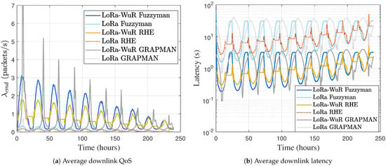 The downlink latency depends on the downlink QoS (i.e., received CMD rate), and it can be calculated for both LoRa and LoRa-WuR schemes by (2) and (4). Further, in the considered scheme, the downlink QoS directly depends on the uplink QoS, following (3) and (5). And the uplink QoS (i.e., packet generation rate) is finally calculated by (9) and (11) according to the used MAC scheme. Figure 8a shows the average downlink QoS during 10 days, with both the traditional LoRa (dashed line) and LoRa-WuR (continued line) schemes, and with the three different EMs. It appears that when there is light, Fuzzyman achieves a downlink QoS between GRAPMAN and RHE, and, by night, it achieves the minimum downlink QoS. GRAPMAN can achieve the highest downlink QoS but in a short time horizon when there is light, and in the night the downlink QoS achieves its minimum, like Fuzzyman. RHE shows a minimum fluctuation of the downlink QoS between night and day. When comparing LoRa and LoRa-WuR schemes(the dashed line compared to the continued line), it is shown that with LoRa-WuR the downlink QoS is 10 times higher than when using the traditional LoRa scheme, as all nodes contribute to forward the CMD in the SR. The average downlink QoS and its variance according to the used EM, and with both the traditional LoRa scheme and LoRa-WuR , are summarized in Table 4.