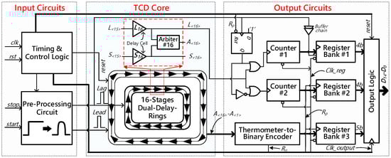 As shown in Figure 2, the TDC core is regarded as the most critical block. It consists of a pair of delay-rings: one for the ‘Lead’ signal and the other for the ‘Lag’ signal. Here, the ‘Lead’ and ‘Lag’ signals inherit the temporal information of the input signals: ‘Start’ and ‘Stop’. The dual delay-rings are constructed with several basic modules, and each module is built up with two delay pairs and one pulse arbiter. Essentially, the delay elements in the delay-ring where the ‘Lead’ signal enters have a larger delay time than those in the delay-ring which receives the ‘Lag’ signal. The time skew measurement is triggered as the ‘Lead’ pulse appears and stopped once the ‘Lag’ signal catches up with the ‘Lead’ signal. The minimal measurable time-interval is mainly determined by both the delay elements and the pulse arbiter. Undoubtedly, the TDC core is a vital part of our proposed circuit, and its detailed architecture and principle will be fully discussed in Section 3.