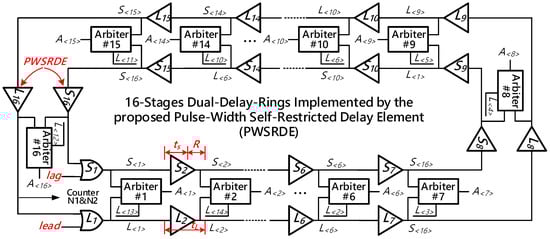 In our design, the TDC core is mainly implemented by a pair of 16-stages delay-rings: the outer ring for the ‘Lead’ signal and the inner ring for the ‘Lag’ signal. As depicted in Figure 3, the delay-rings are formed by connecting the outputs of the last delay elements to the inputs of the first delay elements, and each delay-ring consists of 16 identical delay elements, which are all realized by the proposed PWSR delay element. Besides, a 2-input OR gate replaces a delay element as the first delay stage and is adopted to capture the original input signals. In the dual rings, the delay difference between the OR gates pair is exactly equal to that between the delay element pair. To be specific, the outer and inner rings are respectively constructed with L1~L16 and S1~S16. The delay time of the Li, namely tL, is set to be slightly larger than that of Si, namely tS. As the measurement begins, the ‘Lead’ signal first propagates through the outer delay-ring circularly and it generates a delayed output after each delay element. The ‘Lag’ signal arrives later but it experiences smaller delays in the delay-ring and chases the ‘Lead’ signal. Besides, the 16 arbiters (A1~A16) are connected to the outputs of L1~L16 and S1~S16 to monitor the states of the dual delay-rings. In principle, the time-resolution, namely R, is equal to the difference between the two delay elements, which can be calculated as: