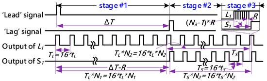- During the 1st stage, merely the ‘Lead’ signal is fed into the 16-stages dual delay-rings. Before the ‘Lag’ signal enters the inner delay-ring, the effective pulse of the ‘Lead’ signal will be transmitted through the outer delay circularly. In this stage, the TDC core operates in its coarse measurement mode. Commonly, the 1st counter, which can be found in Figure 2, will increase every alternate cycle. Hence, the time-resolution in the 1st stage is 16tL. As the valid rising edge of the ‘Lag’ signal appears, the 1st counter will be halted immediately, and then its count value is stamped as N1. The value of the least significant bit (LSB) of N1 is 16tL.
