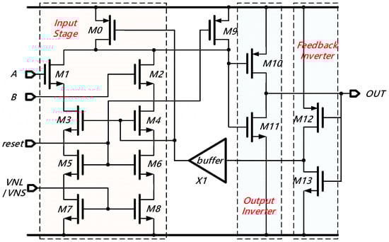 Figure 5 exhibits the schematic of the proposed PWSR delay element. Fundamentally, the PWSR delay element comprises four blocks, namely the input stage (M0-M8), the output inverter (M10-M11), the feedback inverter (M12-M13), and the buffer (X1). In the input stage, M1, M3, M5, and M7 along with M2, M4, M6, and M8 form two identical current branches to alleviate the influence of device mismatch. The input signals ‘A’ and ‘B’ are respectively connected to the gates of M1 and M2. It should be noted that in each delay-ring, only the first delay element (L1 or S1) employs two sets of input ports simultaneously. The remaining delay elements merely employ one of the two input ports, and the other input port is directly connected to the ground. Moreover, the gates of transistors M5, M6, and M9 are controlled by the ‘reset’ signal. Circuit resetting is carried out by applying a negative-going step to the ‘reset’ node before the initial state and after each quantization. In this case, the output of the PWSR delay element will be clamped at a low level. The transistors M7 and M8 act as a pair of current sinks, whose values are controlled by external voltage ‘VNL’ or ‘VNS’. Accordingly, the delay time can be effectively programmed by adjusting ‘VNL’ or ‘VNS’. The output stage is constituted with transistors M10 and M11 and it is utilized for enhancing the driving capability of the PWSR delay element during the transition operation. The feedback inverter is composed of transistors M12 and M13, it sends the output signal back to the input stage through a unity-gain buffer. When a positive pulse is applied to the input terminal, a positive-going step will subsequently appear in the output terminal after a certain delay time controlled by ‘VNL’ or ‘VNS’. Once the output signal goes high, M3 and M4 will be cut off, and both branches of the current sinks will not consume any static power. Meanwhile, transistor M0 will go into the saturation region. Consequently, the output of the PWSR delay element will be pulled down to the ground. Thanks to the fast feedback chain, the pulse-width of the output signal will be restricted within an ultra-narrow range and this makes the PWSR delay element be suitable for high precision TDC.