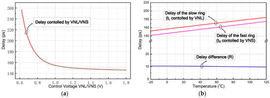 The simulated results of the proposed PWSR delay element: (a) dependence of the delay time on the controlled voltage VNL/VNS and (b) dependence of the delay time on temperature.