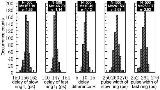 Apart from the above single-point analysis, we also evaluate the performance of our proposed PWSR delay element by Monte Carlo simulation. The statistical analysis of five critical parameters have been performed, including the delays (tL, tS) and pulse-widths of the delay elements in the fast and slow rings as well as the time-resolution. ‘VNL’ and ‘VNS’ are set to 0.95 V and 1.70 V, respectively. As shown in Figure 7, for the delay element in the slow ring that is controlled by ‘VNL’, the mean value and the standard deviation of its propagation delay are 157.19 ps and 1.36 ps, respectively. Likewise, for the delay element in the fast ring that is controlled by ‘VNS’, the mean value and the standard deviation of its propagation delay are 146.7 ps and 1.14 ps, respectively. Besides, the standard deviation of time-resolution ‘R’ is merely 1.12 ps. Furthermore, it can be observed that the mean values and standard deviations of the pulse-widths for a PWSR delay pair are 261.53 ps, 2.68 ps, and 263.07 ps, 2.52 ps, respectively. This signifies that the proposed PWSR delay element can provide relatively stabilized delay and pulse-width, and thus it is suitable for high-resolution TDC.