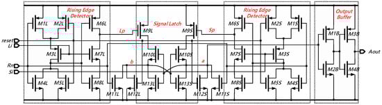 The proposed fully symmetric arbiter is schematically illustrated in Figure 8. In short, it consists of a pair of identical rising-edge detectors (M1L~M8L and M1S~M8S), a signal latch (M9L~M13L and M9S~M13S), and an output buffer (M1B~M4B). As shown in Figure 8, not only the left and right rising-edge detectors are symmetrical to each other, but also the signal latch holds a fully symmetric topology. In the arbiter being worked upon, the input signals ‘Li’ and ‘Si’ are respectively fed into the left and right rising edge detection circuits. Both ‘Rn’ and ‘reset’ are reset control signals: one for local resetting and the other for global resetting. Once a negative pulse is applied to the reset signals, the arbiter will be shut down since the rising edge detectors are disabled. Otherwise, the arbiter begins to compare the arriving sequence of ‘Li’ and ‘Si’, which respectively propagate through the outer and inner delay-rings in the TDC core. When a positive pulse arrives at its input terminal, each of the edge detectors will output a negative step. Meanwhile, the output of the edge detector will be temporally stored and subsequently transformed into a positive pulse by the signal latch. Finally, a positive-going pulse will be sent to the output terminal with a strong driving capability through the output buffer. Consequently, the arbiter outputs ‘0’ when the signal ‘Li’ reaches the input node firstly, and this means the ‘lag’ signal has not caught up to the ‘lead’ signal yet. Likewise, the arbiter outputs ‘1’ when signal ‘Si’ arrives earlier, in other words, the ‘lag’ signal catches up to the ‘lead’ signal. In this way, the location where the first ‘01’ transition occurs in the dual delay-rings can be efficiently detected and then used to latch the 2nd counter.