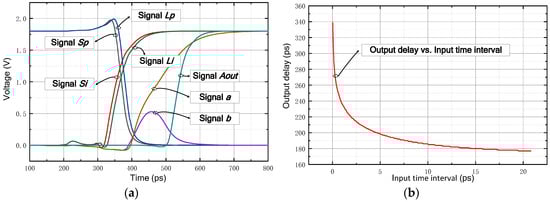 The simulated transient result of the proposed fully symmetric arbiter is shown in Figure 9a. The output waveforms of several critical nodes are provided for analysis, including the input signals ‘Si’ and ‘Li’, the output signals ‘Aout’, and the inner signals ‘Lp’, ‘Sp’, ‘a’ and ‘b’. The time-interval between ‘Si’ and ‘Li’ is set as 10 ps. As shown in Figure 9a, when ‘Si’ arrives earlier than ‘Li’, ‘Sp’ and ‘Lp’ are pulled up to high level successively. Meanwhile, the inner node ‘a’ outputs a higher voltage than node ‘b’; thereafter, signal ‘a’ is boosted to the supply voltage by the output buffer and finally sent to the output node ‘Aout’. Besides, Figure 9b exhibits the correlation of the arbiter delay time and the input time-interval. It is apparent that the output delay increases dramatically when the time-interval shrinks to less than 1 ps. As the input time-interval excesses 10 ps, the arbiter delay is beginning to stabilize.