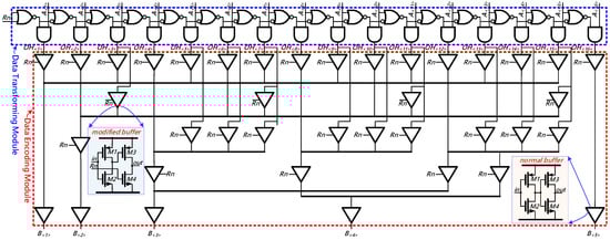 In the proposed TM2B encoder, the data transforming module is built with 16 sets of cascaded transforming elements formed by logic gates. The data encoding module is mainly implemented by two kinds of buffers, namely modified buffer and normal buffer. As shown in Figure 10, the normal buffer is made up of a pair of inverters connected in series; whereas the modified buffer is realized by interrupting the connection between the gate of M4 and the output of the first inverter. In addition, a local reset signal ‘Rn’ is also inserted in the modified buffer. As discussed before, the arbiters will be reset as a negative-going pulse is applied to ‘Rn’ and thus the input signal (A<16>~A<1>) of the TM2B encoder will remain zeros. Meanwhile, the gate of transistor M3 in the modified buffer will be pulled up to ‘1’ so that M3 will be cut off. Furthermore, since there is merely one ‘1’ in the one-hot code (OH<16>~OH<1>), the modified buffers in our proposed TM2B encoder can operate properly even though some of their output terminals are directly shorted. Based on the analysis, the outputs of the proposed TM2B encoder can be expressed as follows: