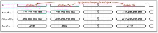 The architecture of our proposed TM2B encoder is shown in Figure 10. It can be generally divided into two main components: namely the data transforming module and the data encoding module. A<16>~A<1> are the outputs of the 16-stages arbiter chain. Rn is a local reset signal. The operation principle of the proposed TM2B encoder can be also divided into two basic phases. In the first phase, the data transforming module converts the thermometer code (A<16>~A<1>) into a 16-bit one-hot code (OH<16>~OH<1>), in which all of the elements are ‘0’ except for one, which has ‘1’ as its value. Ideally, ‘1’ represents the initial arbiter whose output first changes from ‘0’ to ‘1’ and specifies the location where the ‘Lag’ signal catches up with the ‘Lead’ signal. In the second phase, the data encoding module converts the 16-bit one-hot code (OH<16>~OH<1>) into a 5-bit binary code, which will be merged with the outputs of the aforementioned counters. To make it explicit to follow, Figure 11 analyses the timing diagram of our proposed TM2B encoder.