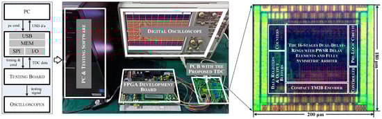 The proposed vernier TDC, which employing a 16-stages dual delay-rings based on PWSR delay element and fully symmetric arbiter, has been implemented and fabricated by standard 0.18-µm one-poly four-metal (1P4M) CMOS process. The die micrograph of the prototype is shown in the right half of Figure 12. The active area of the proposed circuit is about 200 µm × 180 µm. The left half of Figure 12 exhibits the setup of the chip test system. The Xilinx Virtex-5 FPGA development board serves as a microcontroller. It not only transmits the control signals to the testing board through SPI and receives valid data from TDC chip, but also sends the acquired data to the PC and receives the configuration instructions through a USB port in the meantime. The Keysight Technologies digital oscilloscope is employed for ripple measurement. Besides, the PC behaves like a host. It programs the configuration files to the FPGA device and manages the collected datasets. The PCB board contains the fabricated TDC and several auxiliary circuitries that enable the proposed TDC to work properly.