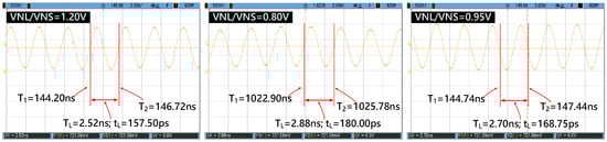 Figure 13 shows the measured output waveforms of the pulse-width widened ‘L16/S16’ when the delay time control voltages ‘VNL/VNS’ are respectively set as 1.20 V, 0.90 V, and 0.95 V. As can be seen from Figure 13, the output waveform has become a sine wave waveform, rather than a normal pulse waveform obtained in the simulated results. This kind of distortion mainly arises from the large load capacitance introduced by the oscilloscope’s probe. As a matter of fact, it hardly changes the signal period, so the measured waveform is still meaningful for chip verification. As shown in Figure 13, the periods of ‘L16/S16’, namely ‘TL’, are respectively measured as 2.52 ns, 2.88 ns, and 2.70 ns as the control voltages ‘VNL/VNS’ are successively set as 1.20 V, 0.90 V, and 0.95 V. Furthermore, by dividing the measured period by the number of stages (16), the delay time of each delay element can be obtained as 157.50 ps, 180.00 ps, and 168.75 ps. From the graph above we can see that there is a significant negative correlation between the delay time of each delay element and the control voltage. Figure 13 demonstrates the functional correctness of our proposed circuit.
