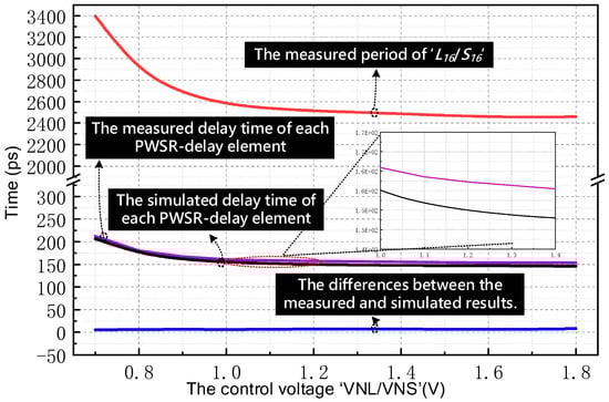 Figure 14 compares the measured and simulated results with successive increases in control voltages, and the inset of Figure 14 shows a magnified view of a portion of the results. In the beginning, the measured period of the 16-stages delay-ring ‘L16/S16’ keeps decreasing as the control voltage varies from 0.8 V to 1.8 V. Then, it tends to be stable as the control voltage exceeds 1.2 V. Obviously, this tendency is consistent with the former theoretical analysis. Besides, the measured and simulated results in terms of the delay time of each PWSR-delay element are also provided in Figure 14. It can be seen that no significant difference between the measured delay curve and the simulated delay curve is evident. More specifically, the calculated delay difference between the measured and simulated results swings from 5.9 ps to 9.6 ps. This demonstrates that the both proposed PWSR-delay element as well as the dual delay-rings in the fabricated TDC can work properly as expected.