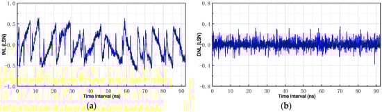 Furthermore, TDC nonlinearities are also evaluated as they impact negatively upon the system resolution. In the literature, the most widely-used metrics to characterize TDC nonlinearities are differential nonlinearity (DNL) and integral nonlinearity (INL) [26]. DNL refers to the difference between each actual output step-width and the ideal output step-width. It provides a mechanism to describe the effects of environmental noise in a simple and uniform way. For an ideal TDC, the output steps have a uniform width. Meanwhile, INL can be defined as maximum deviation of the actual input-output characteristic from the ideal transfer characteristic. INL can be estimated using DNL at each step by calculating the cumulative sum of DNL errors up to that point. In this work, we have obtained the INL and DNL using the code density method and exhibited the results in Figure 15. The worst measured INL and DNL are respectively 0.65 LSB and 0.38 LSB, and both of them are less than 1 LSB. The nonlinearities are normally introduced by a variety of non-ideal effects (such as IR-drop, PVT variations, mismatch, etc.), and they can be partially compensated by circuit optimization [27].