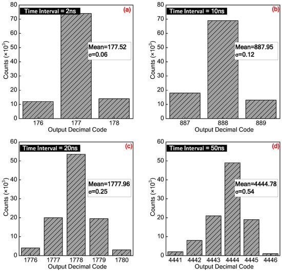 Additionally, the precision of our proposed TDC has also been evaluated by carrying out single-shot measurement. We have collected and analyzed the TDC’s output codes in almost 100,000 consecutive measurements with a fixed input time-interval. Figure 16 presents the statistic histogram of the measured output codes for 4 cases of different fixed input time-interval. From this Figure, we can see that the measured mean values of the TDC output codes for inputs of 2 ns, 10 ns, 20 ns, and 50 ns are respectively 177.52, 887.95, 1777.96, and 4444.78, which sequentially correspond to time-intervals of 1.997 ns, 9.989 ns, 20.002 ns, and 50.004 ns. Moreover, the histogram output codes spread across several positions approximating the Gaussian error distribution, and all of the achieved standard deviations for these 4 cases stay below 1 LSB.