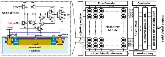 The overall architecture of the 3D image sensor based on our proposed TDC is illustrated in Figure 17. As shown in the right part of Figure 17, the proposed 3D image sensor consists of a pixel array, a row decoder and selector, an offset adjusting register, a bias and reference circuit, a readout multiplexer array, a bank of 16 column-parallel TDCs, a pipelined time-multiplexer, and some other ancillary circuitry. The pixel circuit of this 3D image sensor is schematically shown in the left part of Figure 17. The proposed pixel mainly contains a light-sensitive unit of SPAD and an in-pixel quenching-and-reset circuit (QRC). The SPAD is realized with a p-n junction formed by p+ layer diffused on a deep n-well. A p-well loop is used as the guard ring. The central point of p+ diffusion and the edge of deep n-well are contacted out through the metal layer as the anode contact and cathode contact, respectively. The in-pixel QRC is in charge of not only quenching the large avalanche current but also making sure the SPADs back to bias above the breakdown voltage for the next avalanche event. Overall, the 3D image sensor totally contains 1024 pixels which are placed in 32 rows and 32 columns. To reusing the TDCs, 16 2-to-1 column-multiplexers are placed between the pixel array and the TDC array. A bank of 16 column-parallel TDCs is used to simultaneously process half row SPADs in each measurement. Each TDC channels fit within the pitch of two pixel-column. A full scan of the whole SPAD array takes 64 measurement cycles. The row selection for the connection to TDCs is performed before every measurement based on control data. Moreover, the pipelined time-multiplexer located in the column bus is used to select the pixel, then converts its parallel data into serial bits and sends them out of the chip serially.