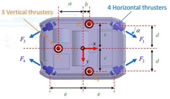 In this paper, an over-actuated AUV is used to define the thruster configuration matrix, as shown in Figure 2. It can be seen that the AUV uses four horizontal thrusters to control the surge, sway, and yaw motions of the AUV, while its three vertical thrusters are applied for heaving, pitching, and rolling motion. Moreover, we assume is the center of the i-th thruster, and the angle between the longitudinal axis and the direction of the thruster force is .