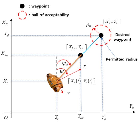 where, is the safety radius that is set to the center of each waypoint, (, ) is the present waypoint, is the length of the AUV; n is the positive value that combines with to estimate the safety radius; (, ) and (, ) are two adjacent waypoints, in which one is the present waypoint or the actual position of the AUV that is estimated by global positioning system (GPS), and the other one is the desired waypoint. is the actual heading angle of the AUV measured by inertial measurement units (IMU) or compass sensor. (, ) is the virtual tracking waypoint. The vector connecting between this virtual tracking waypoint and the actual position of the AUV is the “line of sight”. The angle between the “line of sight” and the north direction of the EF frame is the desired heading angle for the heading control of the AUV is obtained by Equation (39).
