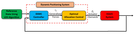 In this section, a DP control system has been used to the individual thruster again the environmental disturbance, for maintaining the position and the heading angle of the AUV. As can be observed in Figure 4, the entire proposed DP control is divided into two related parts, which are the motion control module and the allocation control module. In particular, the role of a motion control system that is designed by using a DSMC law is to generate the generalized control forces and moments. Meanwhile, the allocation control module decides how to distribute these generalized forces and moments to each individual thruster and how to optimize the energy consumption. Both mentioned parts of the suggested DP control are presented in the following sections.