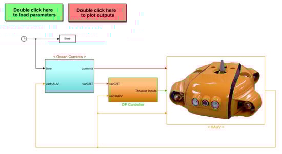 The dynamic model of the AUV in Equation (5) is obtained without considering the ocean current effects. The influence of the ocean current on the motions of the AUV is significant; thus, it is necessary to analyze the response of the AUV to environmental disturbances. To observe the influence of the ocean currents on the AUV, some simplifications are first, made as: