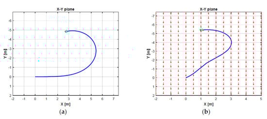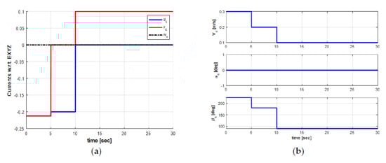 For simulation purposes, the AUV is requested to stay at the desired point from the initial point , where the desired heading angle is generated by the LOS under the changing direction of the ocean current in the simulation. Furthermore, the initial velocity of the AUV is set to be . The behavior of the ocean current effects acting on the AUV can be observed again in Figure 6. It can be seen that, at the first stage ( [s]), the setting direction of the ocean current is between the South and West directions. Meanwhile, at the second stage ( [s]), the ocean current flows towards the x-direction, and at the third stage ( [s]), the ocean current flows towards the y-direction.