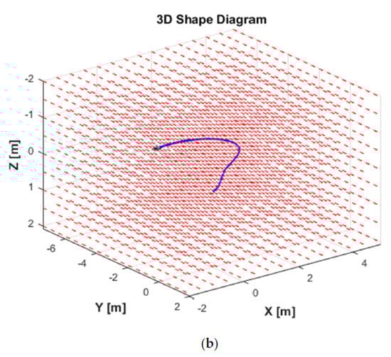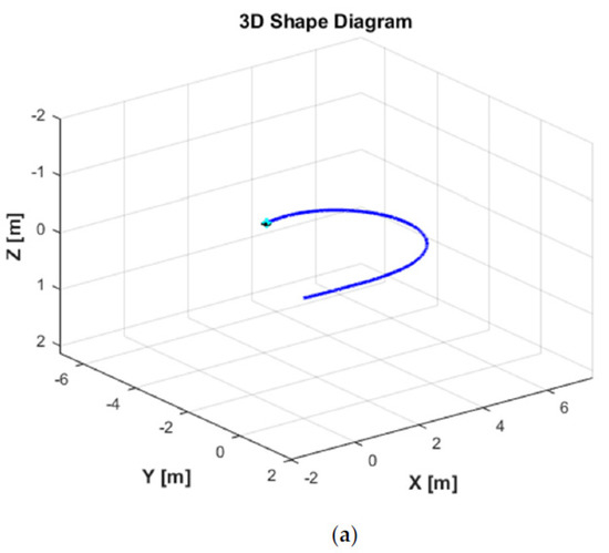 Figure 6 shows the ocean current form with its three parameters in the EF frame. As can be seen in Figure 6b, the ocean current flows in the direction between South and West directions with the following parameters: m/s, degree, and degrees from t = 0 s to t = 5 s. Then, the ocean current unexpectedly changes its direction to the South direction with the changing parameters, i.e., m/s, degree, and degrees from t > 5 s to t = 10 s. Finally, the ocean current suddenly varies its direction to the East direction, and the parameters are the following: m/s, degree, and degrees from t > 10 s to the end of the simulation time t = 30 s. In addition, the ocean current vector in the EF frame during the simulation is shown in Figure 6a. Under these ocean current configurations, the 2D trajectory behavior of the AUV during the turning motion can be observed in Figure 7. Meanwhile, the significant effect of the ocean currents on the turning motion of the AUV can be observed in the 3D trajectory shown in Figure 8.