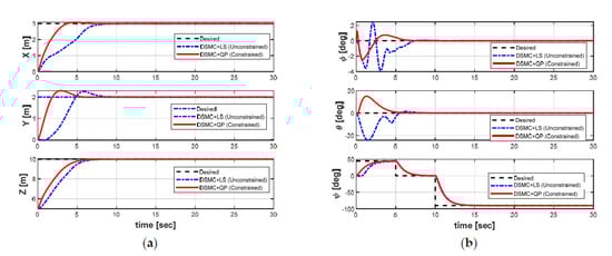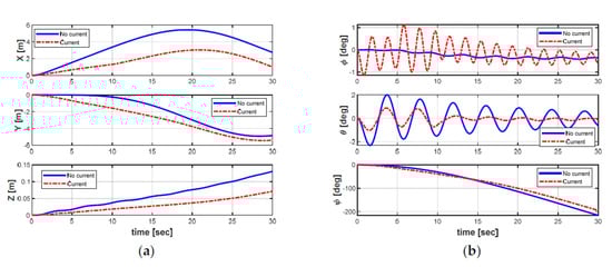 Position and orientation of the AUV in both cases: (a) position; (b) Euler angles.