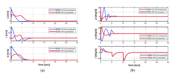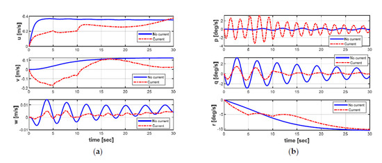 Velocities of the AUV in both cases: (a) linear velocities; (b) angular velocities.