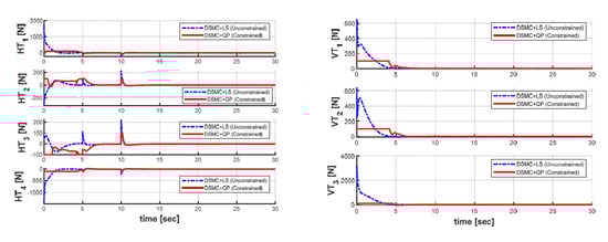 Unconstrained Thrust Allocation: In this case, the unconstrained thrust allocation is applied using the standard damped inverse, i.e., the LS method. To do so, a high virtual constraint on the individual thruster force is applied to guarantee that the saturation limit on each thruster will never occur. Thus, these constraints are bounded to and in this simulation.