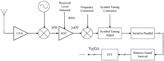 Figure 1 illustrates the signal processing in the Wi-Fi receiver block diagram [42]. The signal from receiver antenna is down converted to base band signal y(t) through a mixer. Due to the path loss and multipath fading, the received signal strength is weaker than the transmitted signal strength. In order to maintain stable received signal strength for better wireless communication, AGC could amplify the signal strength dynamically according to Received Signal Strength Indicator (RSSI). The amplifier gain is large when the received signal strength is weak, so the amplifier gain can be considered as the function of RSSI . Let yg(t) represents the received signal after AGC, yg(t) can be denoted as:
