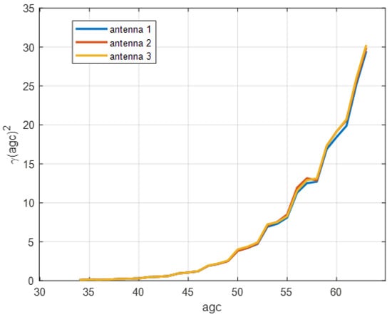 In order to get the relationship of γ2(agc) and agc, we have collected a sufficiently large volume of CSI data. During data collection, we change the positions of transceivers as much as possible in order to get as many agc values as possible. Then, through Equation (17), we can obtain the value of γ2(agc) corresponding to each agc, and we can get the relationship of γ2(agc) and agc, which is shown in Figure 2. From Figure 2, we can see that the value of γ2(agc) increases with the increases of agc. That is to say, when the received signal power is small, will be increased in order to sustain a stable level of the received signal power. Moreover, the three antennas of an Intel 5300 WiFi Card use the same AGC gain circuit.
