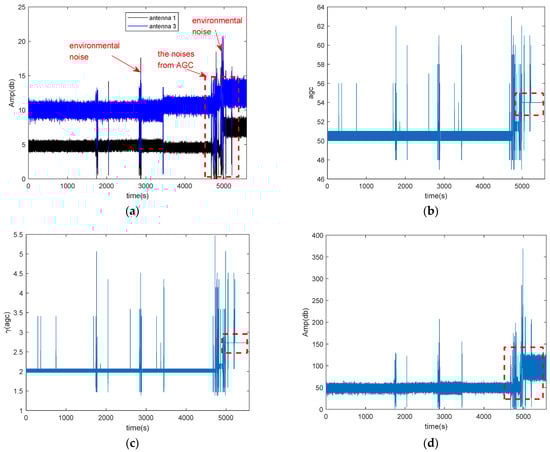 Figure 3a shows the CSI amplitudes of two antennas, which contain the environmental noise and the noise of AGC. From Figure 3a, we can find besides some fluctuations which caused by environmental noise, the amplitude is divided into two segments at about 5000 s, as marked by red rectangle. Figure 3b,c shows the coefficients agc and γ(agc), respectively. There is also has a similar but smaller jump at around 3500 s in the Figure 3a, but the agc of the corresponding CSI amplitude remains relative stable except for some outliers. These outliers may be caused by environmental noise, how to remove the environment noise is out of scope of our paper. From Figure 3b,c, we can find that agc and γ(agc) are also divided into two segments at about 5000 s. Therefore, we can conclude that the jumping of amplitude at about 5000 s is caused by AGC. Figure 3d shows the amplitude of conjugate multiplication between the CSI of two antennas. From Figure 3d, we can find that the amplitude of conjugate multiplication between the CSI of two antennas also divided into two segmentations at about 5000 s due to AGC.