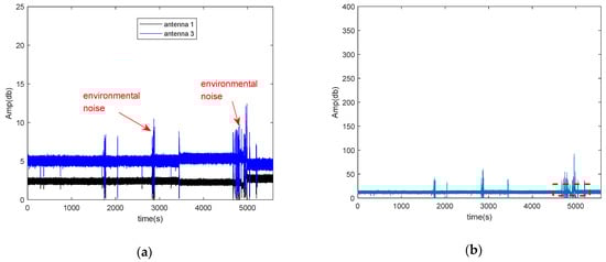 The amplitude of CSI and the conjugate multiplication between the CSI of two antennas after removing the noise of AGC is shown in Figure 4. Figure 4a shows CSI amplitude of two antennas after removing the noise of AGC, and Figure 4b shows the amplitude of conjugate multiplication between the CSI of two antennas after removing the noise of AGC. From Figure 4, we can find that after removing the noise of AGC, there only exists environmental noise, and the amplitude of conjugate multiplication between the CSI of two antennas is more stable than before removing the noise of AGC.